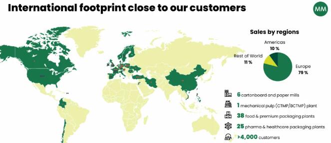 MM集團是歐洲最大的包裝紙和紙板生產商之一,其業務范圍廣泛,涵蓋原生纖維紙板、再生紙板、包裝紙、牛皮紙、面紙、阻隔紙板、非涂布文化紙和紙漿等多種紙品。目前,集團在波蘭、芬蘭、斯洛文尼亞、挪威、奧地利、德國等多個歐洲國家擁有6家紙廠和1家機械漿紙廠,共計10條包裝紙和紙板生產線。集團的年產能約為310萬噸,涵蓋紙漿和紙板,員工總數約為4326人。