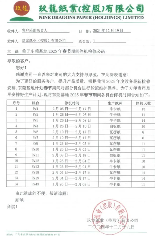 12月19日,東莞玖龍發(fā)布了2025年春節(jié)停機檢修計劃,該基地14臺紙機將在2025年1月底至2月中旬期間輪停8-16天,預(yù)計減產(chǎn)17.5萬噸包裝紙,其中包括13.8萬噸箱板瓦楞紙和3.7萬噸白板紙。
