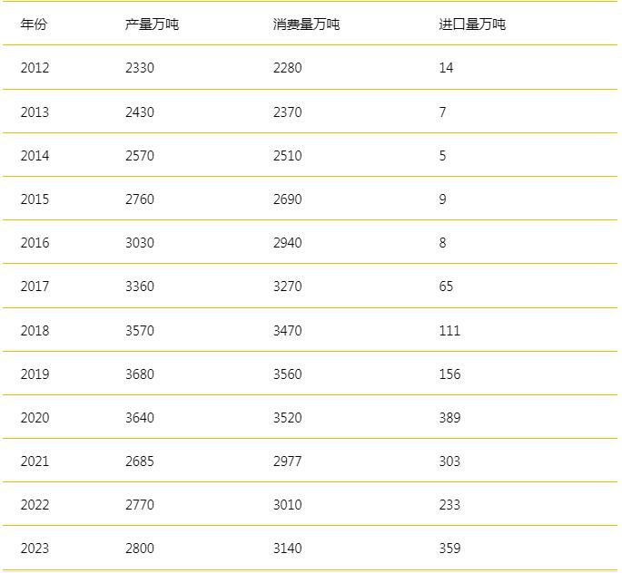 2012-2024年我國瓦楞紙產(chǎn)、銷及進(jìn)口量: