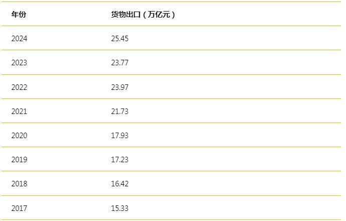 據(jù)海關(guān)統(tǒng)計,2024年,我國貨物貿(mào)易出口規(guī)模首次突破25萬億元,達(dá)到25.45萬億元,同比增長7.1%,過去8年貨物出口增長十萬億元。