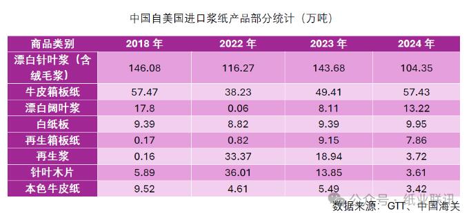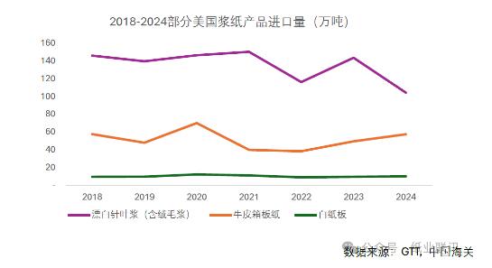 從美國進口的漿紙產品亦在此輪加征范圍內。據海關數據顯示,2024年中國自美國進口漿紙類產品金額總計約18.95億美元,約占中國進口漿紙總額的6.49%。其中,針葉漿(含絨毛漿)、牛卡,闊葉漿以及白卡紙是中國自美國進口漿紙中數量比較大的類別。