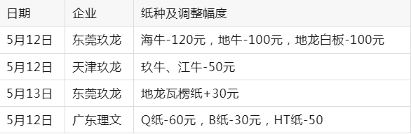 5月12日,玖龍天津、河北基地宣布下調多類紙種價格。天津基地玖龍牛卡、江龍牛卡每噸下調50元,再生紙下調30元;70-115克地龍、海龍瓦楞紙同步下調50元,120-125g、140-170g地瓦海瓦降幅均為30元。