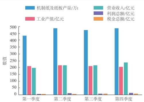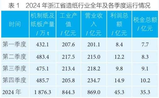 整體看,除第一季度外,后續3個季度產量均穩定在475萬t以上高位,顯示出較強的生產韌性,表明浙江省造紙行業生產規模持續擴大,市場需求保持較高水平。浙江省2024年全年工業總產值844.3億元(見圖1),同比略降0.4%,反映出需進一步優化產品結構,提高產品附加值;營業收入逐季攀升,從第一季度的201.1億元持續增長至第四季度的234.7億元(全年最高),全年累計869.0億元,同比增長2.2%,庫存消化或產銷銜接效率較高,但增幅相對有限,需加強市場滲透與品牌建設;利潤總額為45.3億元,同比下降2.2%,顯示成本控制壓力依然存在,行業競爭激烈;稅金總額35.3億元,同比增長12.4%,稅收貢獻顯著上升,反映出部分企業盈利結構相對健康。