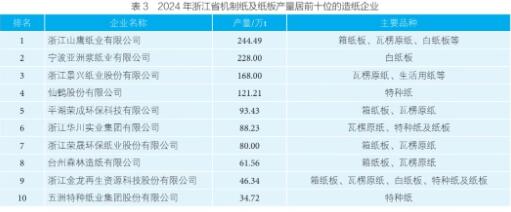 2024年浙江省機制紙及紙板產量居前十位的造紙企業合計生產機制紙及紙板產量1165.98萬t,占全省總產量的62.14%(見表3)。