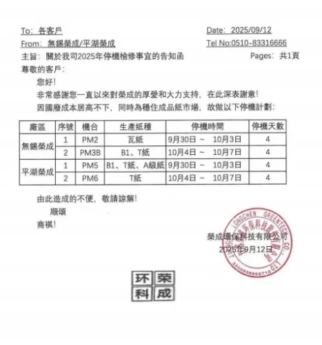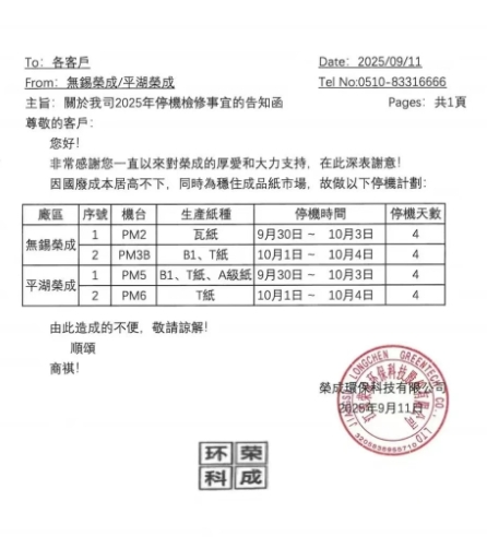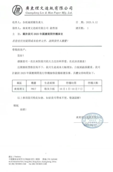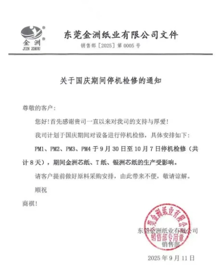 從2025年9月18日起,針對(duì)集團(tuán)旗下包裝紙系列產(chǎn)品在現(xiàn)有價(jià)格基礎(chǔ)上,上調(diào)30元/噸。