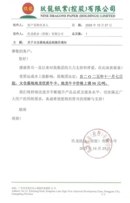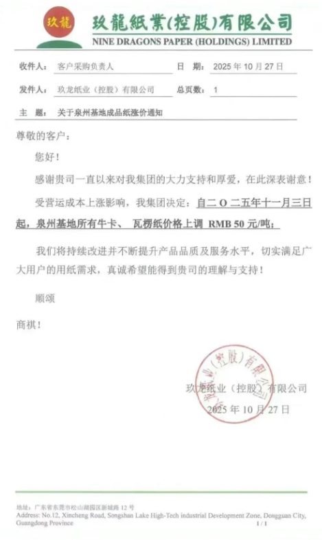 自十一月三日起,泉州基地所有牛卡、瓦楞紙價格上調 RMB 50 元/噸。