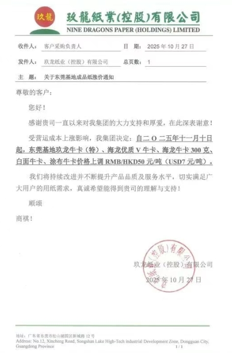 自十一月十日起,東莞基地玖龍牛卡(特)、海龍優(yōu)質V牛卡、海龍牛卡300克、白面牛卡、涂布牛卡價格上調RMB/HKD50元/噸(USD7元/噸)。