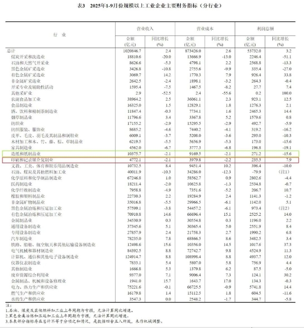值得關(guān)注的是,造紙和紙制品業(yè)實(shí)現(xiàn)利潤(rùn)總額271.2億元,同比下降15.6%;印刷和記錄媒介復(fù)制業(yè)實(shí)現(xiàn)利潤(rùn)總額235.5億元,同比增長(zhǎng)7.9%。