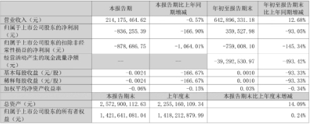 公司營業總收入211.33億元,同比下降2.17%,歸母凈利潤-2.9億元,同比下降522.74%。