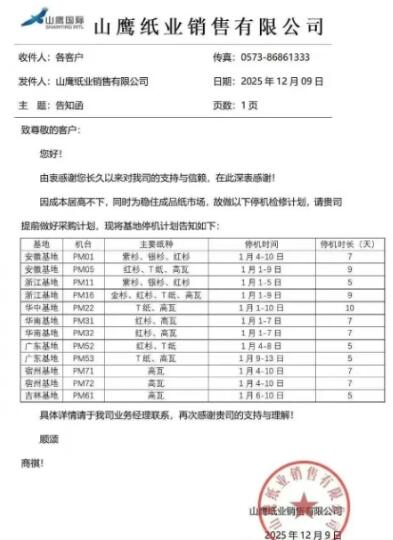 山鷹國際國內7大基地共12臺箱板瓦楞紙機將在1月1-13日期間輪停5-10天,按照設計產能計算,預計削減市場供應約10.8萬噸。