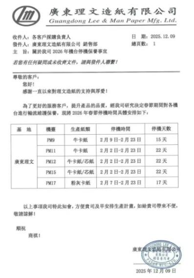 三家龍頭紙企宣布停機計劃,預計2026年初減產約27萬噸包裝紙