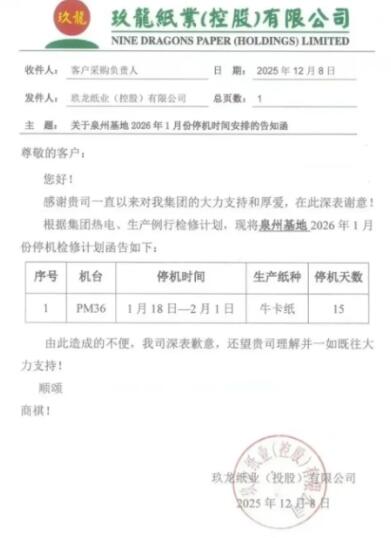玖龍紙業泉州基地的PM36將從1月18日停機至2月1日,預計減產箱板紙1.3萬噸。此外,玖龍北海基地的PM48將在1月底減產約2.6萬噸箱板紙。