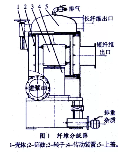 分級篩是在封閉狀態下帶壓力連續篩選的設備。帶壓紙漿由殼體下部的進漿管成切線方向進入篩體內,漿料自下向上進入。在離心力作用下,重雜質沿篩體內壁向下直排入下殼體重質捕集罐(間歇排渣);漿料進入上殼體的篩鼓內,在旋翼作用下,短纖通過篩縫,從殼體中間出漿管排出,長纖維通不過篩鼓的篩縫,不斷上升,進入篩頂部,從頂部長纖出漿管排出;在離心力的作用下,輕雜質在篩鼓內不斷上升,不進入旋翼與篩鼓之間的區域,與長纖維一道從頂部排出。