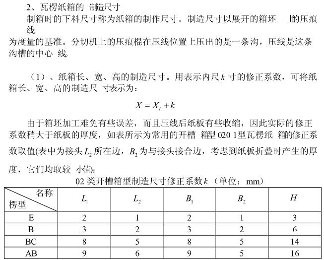 瓦楞紙箱由三個尺寸組成:內(nèi)尺寸,制造尺寸,外尺寸。制造尺寸是確定箱坯上切斷、開槽、壓線位置的尺寸。
