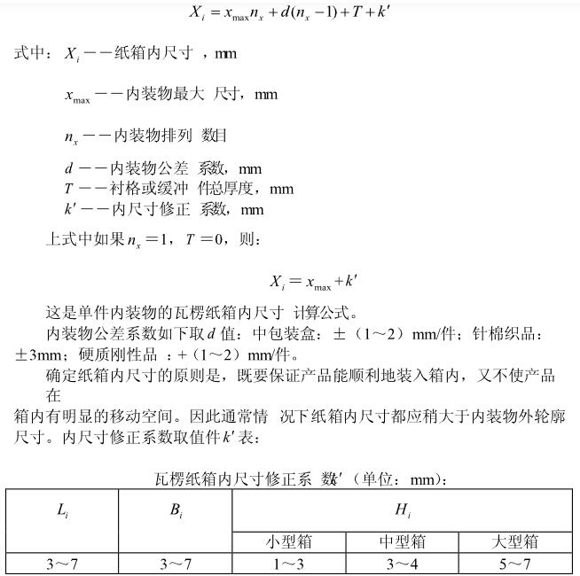 除錯列排列的圓柱形內(nèi)裝物以外,其他內(nèi)裝物的瓦楞紙箱內(nèi)尺寸計算公式如下: