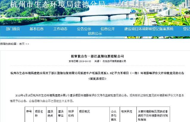 近期,浙江省杭州市生態環境局建德分局發布環評審批意見公告,擬批準浙江盈翔包裝年產1.5億紙板紙箱項目實施。