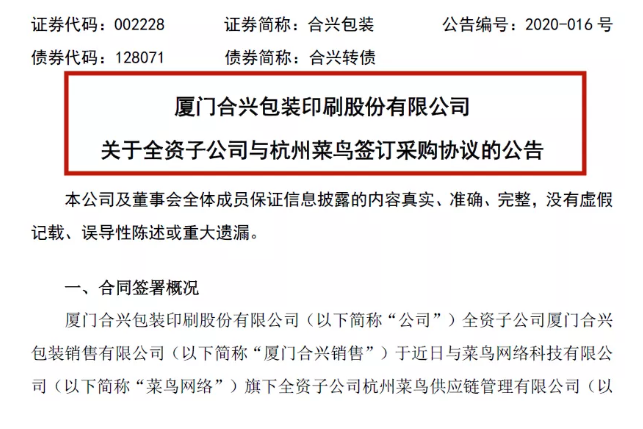 就在不少紙板紙箱廠都傳出客戶取消訂單的不利情勢之下,廈門合興包裝卻逆境中突圍,成功與杭州菜鳥網絡簽下了一年的包材采購訂單,協議有效期自2020年4月1日起至2021年3月31日止。行業老大哥拿下這個大訂單的好消息,無疑給了業界企業一個正面的激勵!干的漂亮!