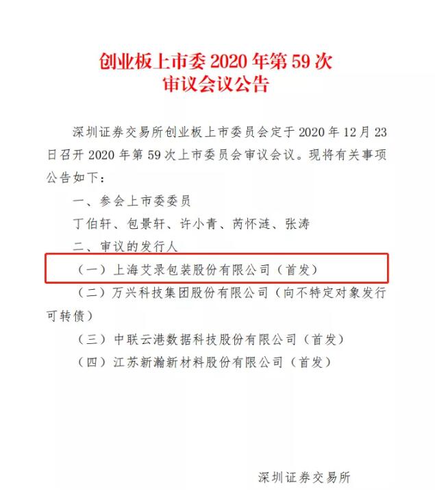 12月23日晚間,深交所官網發布的創業板上市委2020年第59次審議會議結果公告顯示,上海艾錄包裝股份有限公司(以下簡稱“艾錄股份”)的首發符合發行條件、上市條件和信息披露要求。