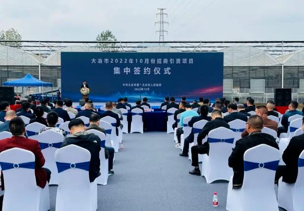 10月29日,湖北省大冶市10月份招商引資項目集中簽約活動在大箕鋪鎮瑞宸生態農業產業園舉行。當天,大冶市簽約12個項目,計劃總投資23.2億元,涵蓋智能裝備制造、新材料、紡織服裝、現代農業、現代服務業等多個領域。