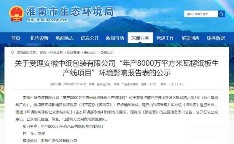 6月7日,安徽省淮南市生態環境局公示顯示,關于受理安徽中紙包裝有限公司“年產8000萬平方米瓦楞紙板生產線項目”環境影響報告表的公示。