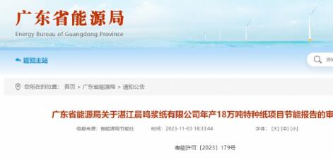 11月3日,廣東省能源局發布湛江晨鳴漿紙有限公司年產18萬噸特種紙項目節能報告的審查意見。