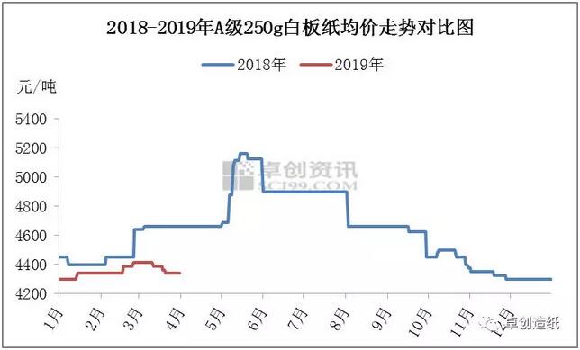 2019年一季度白板紙價格先上漲后震蕩下調(diào)。1月份白板紙價格穩(wěn)中上揚(yáng),主因下游客戶積極備貨,庫存低位,市場內(nèi)利好因素釋放,漲價預(yù)期增強(qiáng),月初浙江富陽地區(qū)率先上調(diào)價格100元/噸,中旬部分規(guī)模紙廠價格上調(diào)50-100元/噸。1月下旬隨節(jié)前備貨逐漸結(jié)束,紙廠陸續(xù)停機(jī),市場交投轉(zhuǎn)淡,價格歸穩(wěn)。2月份上旬,白板紙市場節(jié)日氛圍仍濃,交易處在恢復(fù)階段,波動減少;2月下旬,紙廠多恢復(fù)生產(chǎn),浙江富陽地區(qū)產(chǎn)能騰退100多萬噸,率先上調(diào)100元/噸,隨后其他地區(qū)跟漲50-100元/噸。然進(jìn)入3月份白板紙價格呈現(xiàn)階梯式下滑,受限于市場需求面動力不足,自中旬起弱勢加劇,部分規(guī)模紙廠率先下調(diào)100元/噸,周邊地區(qū)紙張跟跌50-100元/噸,降價并未明顯刺激需求,市場交投氛圍不濃,業(yè)者看跌心態(tài)加劇,部分規(guī)模紙廠繼續(xù)下調(diào)100元/噸,其他地區(qū)紙廠跟跌,全國白板紙市場價格普降。2019年一季度白板紙均價4340.22元/噸,環(huán)比下調(diào)0.65%,同比下降3.82%。