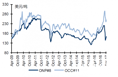 本周美廢ONP、OCC 價(jià)格上漲,ONP #8 報(bào)160 美元/噸,較上周上漲3.23%;OCC#11 報(bào)255 美元/噸,較上周上漲2.00%。本周美廢外盤市場(chǎng)行情繼續(xù)走高,OCC 主港報(bào)盤至 270-275 美元,實(shí)單成交約至 270 美元左右; 8#主港報(bào)盤至 170 美元以上,未見(jiàn)實(shí)單。目前國(guó)內(nèi)下游紙廠需求并不十分良好,且由于 2017 年環(huán)保證審查頗為嚴(yán)格,部分紙廠并未獲準(zhǔn)相應(yīng)額度。據(jù)分析,近日進(jìn)口廢紙市場(chǎng)價(jià)格的強(qiáng)勢(shì)走高可能與少數(shù)大型紙廠的積極推漲有關(guān),或有意以此支撐箱板瓦楞等成品紙市場(chǎng)的穩(wěn)定。