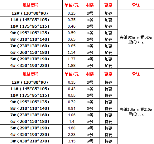 紙箱網為大家提供的報價數劇來源于阿里巴巴TOP10銷售商中位數,基本可以反映當期紙箱成品的價格,方便大家參考。