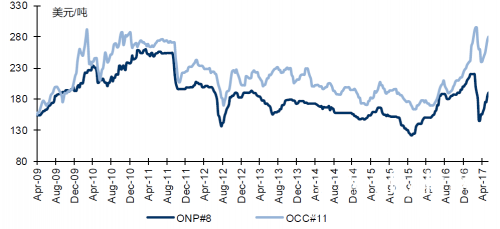 本周美廢ONP、OCC價格上漲。ONP #8報190美元/噸,較上周上漲2.70%;OCC#11報295美元/噸,較上周上漲1.72%。本周美廢外盤市場報盤繼續(xù)走高,OCC主港報盤至298-300美元,國內(nèi)下游紙廠接受度不高,目前并未聽聞295美元以上實單成交。8#主港報盤至195-198美元,小量實單成交至193-194美元,大型新聞紙廠還盤價格較低,預計近期有較大量采購計劃,實單價格仍在洽談中。美廢外盤市場價格已接近年初高點,特別是OCC,漲勢十分強勁,貿(mào)易商與紙廠買家均持以謹慎態(tài)度,市場觀望情緒濃厚。