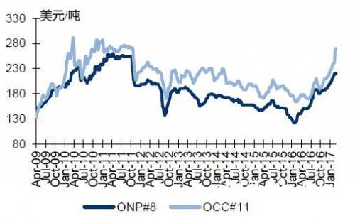 本周美廢ONP 價(jià)格維穩(wěn)、OCC價(jià)格上漲,ONP#8報(bào)220美元/噸,持平上周;OCC#11報(bào)290美元/噸,較上周上漲3.57%。本周美廢外盤市場行情持續(xù)漲勢,春節(jié)過后,多方利好因素推動(dòng)美廢價(jià)格強(qiáng)勢上行。從供應(yīng)方面看,美國本土工廠需求良好,中國國內(nèi)大型紙廠在美國積極采購,推動(dòng)美廢價(jià)格迅速上漲,同時(shí)導(dǎo)致中國市場可貿(mào)易量減少,供應(yīng)商議價(jià)能力增強(qiáng)。另外,國際海運(yùn)運(yùn)費(fèi)增加,成本上揚(yáng),也成為進(jìn)口廢紙價(jià)格推漲的動(dòng)力之一。