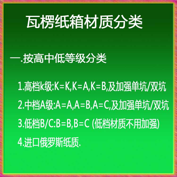 紙箱材質明細分類:用字母代替:黃五層有進口紙箱俄B=B,國產K=K,K=A,K=B,K=C,A=A,A=B,A=C,B=C及加強牛皮紙箱(瓦楞紙箱)