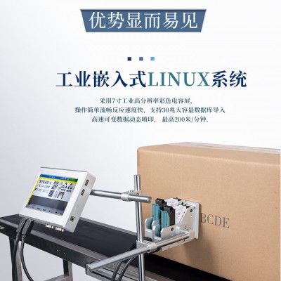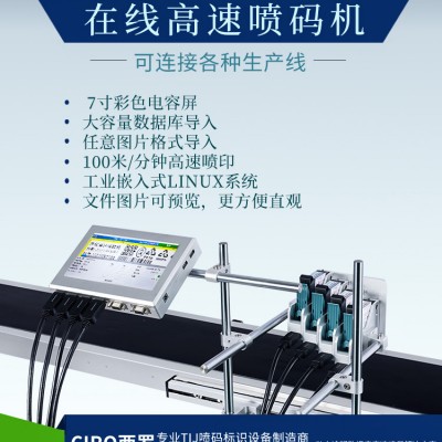 CR高速在線噴碼機,由單頭或多頭拼接,CR高速在線噴碼機,7寸彩色電容屏,LINUX系統(tǒng),噴印速度可達100米/300DPI,內(nèi)含大容量存儲,可變數(shù)據(jù)庫,動態(tài)數(shù)據(jù)噴印。