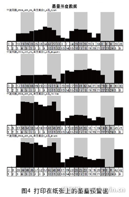 目前國(guó)內(nèi)保有量最大的報(bào)業(yè)輪轉(zhuǎn)印刷機(jī)直接通過(guò)墨斗調(diào)節(jié)輸出墨量。一般人都認(rèn)為這種調(diào)墨機(jī)構(gòu)過(guò)于簡(jiǎn)陋,無(wú)法與油墨預(yù)置技術(shù)相關(guān)聯(lián)。實(shí)際上我們發(fā)現(xiàn),針對(duì)報(bào)紙印刷,將油墨預(yù)置的計(jì)算結(jié)果打印在A4幅面的紙張上,如圖4所示,然后讓印刷工人按照柱狀圖和相應(yīng)的數(shù)據(jù)調(diào)節(jié)墨斗輸出墨量,是切實(shí)可行的。對(duì)于印刷工人來(lái)說(shuō),可以在等待制版的時(shí)間預(yù)先準(zhǔn)確地調(diào)好墨斗,開(kāi)印后不需要緊張忙碌地修正墨鍵,工作更輕松,所以也樂(lè)于接受。