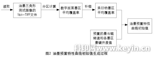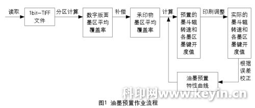 了使本身不具備油墨預(yù)置功能的報(bào)業(yè)輪轉(zhuǎn)印刷機(jī)也能利用印前電子文件,實(shí)現(xiàn)準(zhǔn)確的輸出墨量預(yù)設(shè)置,我們開(kāi)發(fā)了一套報(bào)紙印刷用的油墨預(yù)置軟件。該軟件能自動(dòng)讀取印前數(shù)字文件作為油墨預(yù)置的源文件,獲得版面的圖文面積分布信息,再根據(jù)具體報(bào)業(yè)輪轉(zhuǎn)印刷機(jī)的油墨預(yù)置特性曲線,生成合理的墨斗輥轉(zhuǎn)速、各墨區(qū)墨鍵開(kāi)度值,指導(dǎo)工人準(zhǔn)確地預(yù)置墨鍵,其作業(yè)流程如圖1所示。