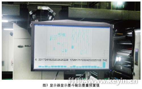 對(duì)于通過(guò)控制臺(tái)調(diào)節(jié)墨量的報(bào)業(yè)輪轉(zhuǎn)印刷機(jī),可以在控制臺(tái)旁邊安裝一臺(tái)顯示器,如圖3所示,直接顯示每一版面的每一色油墨預(yù)置的計(jì)算結(jié)果,印刷工人可根據(jù)柱狀圖及對(duì)應(yīng)的數(shù)據(jù)調(diào)節(jié)墨斗輸出墨量。