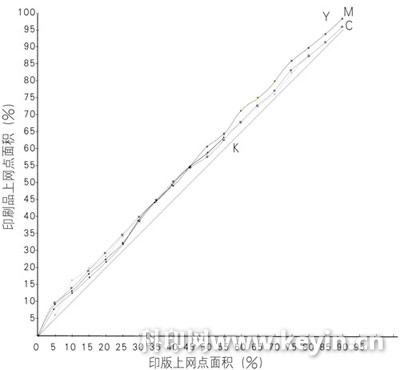 在40%~50%區域網點增大最大。從圖上可以看出無水膠印網點最大增大7%~8%左右。有水膠印一般在20%~25%。