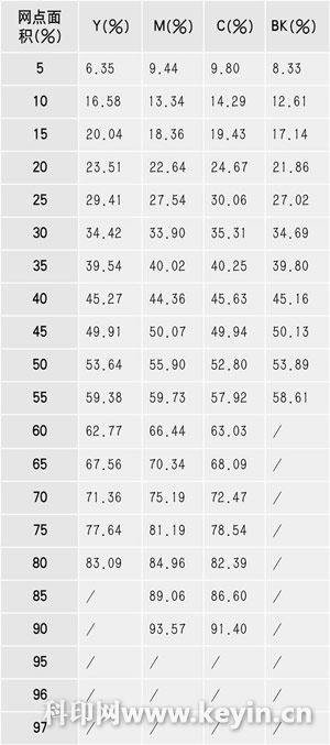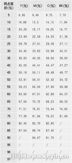 分析出四色網點增大的數據如表1所示,表1的數據是定量為157g/m2的銅版紙的網點總體增大值。