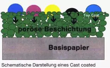 鑄涂紙一般100 g/m2到240 g/m2,基本上是啞光噴墨紙的進(jìn)一步加工。再加工的過程是先澆上一層3-5μm厚的微孔面涂,再用一個高光的熱輥筒烘干。