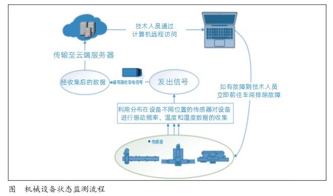 多個安裝在流水線上不同設備、不同部位的傳感器之間可以進行數據聯動,將整個車間設備的運行狀態反映給技術人員,以達到在機器故障時及時準確地找到故障點并排除故障,提高單個設備以及整條生產線的使用壽命。機械設備狀態監測流程如圖所示。