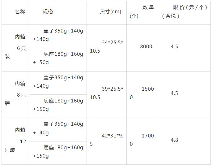 1.3本項目設置最高限價:供應商按不同規格包裝箱進行單價報價,各規格包裝箱單價限價詳見下列表格。供應商報價高于每規格包裝箱最高限價的,其響應將被否決。