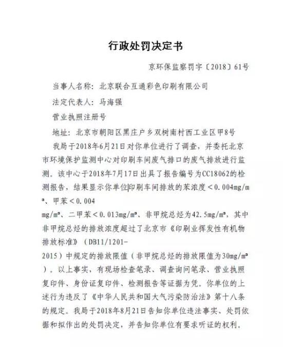 北京環(huán)境保護(hù)局于2018年10月18日發(fā)布了京環(huán)保監(jiān)察罰字〔2018〕61號行政處罰決定書,該文件顯示,北京聯(lián)合互通彩色印刷有限公司因廢氣排放超標(biāo),被處十萬元罰款,并責(zé)令其立即改正違法行為。
