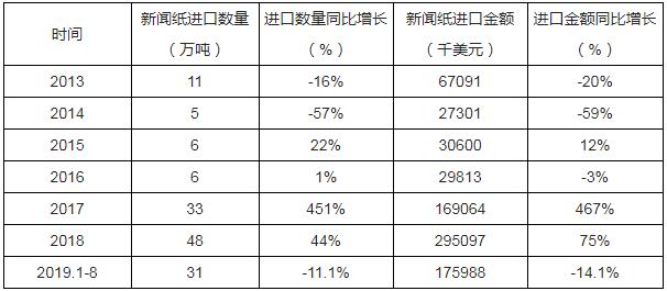 根據中國海關數據顯示:2019年1-8月中國新聞紙進口數量為31萬噸,同比下降11.1%;2019年1-8月中國新聞紙進口金額為175988千美元,同比下降14.1%。