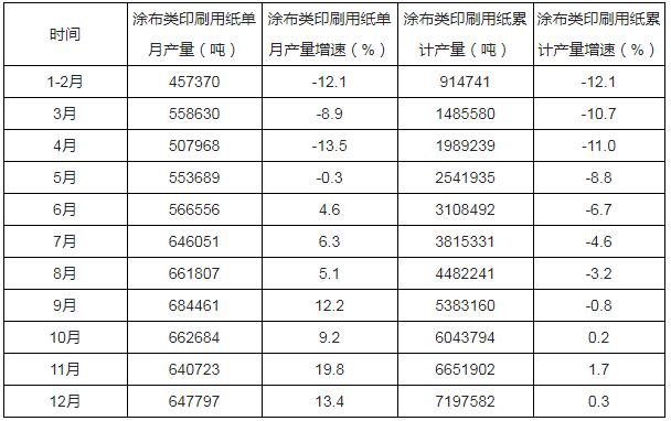 2019年1-12月中國涂布類印刷用紙產(chǎn)量及增速統(tǒng)計表