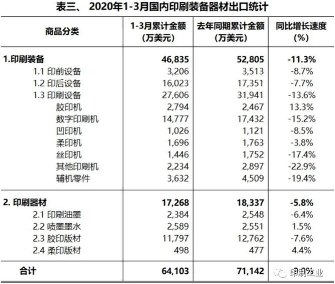 2020年1月—3月,國內印刷器材出口1.73億美元,同比下降5.8%。其中,印刷油墨出口5972噸,2384萬美元(同比下降6.4%);噴墨墨水出口3728噸,2589萬美元(同比增長1.5%);膠印版材出口4690萬平方米,1.18億美元(同比下降7.6%);柔印版材出口12萬平方米,498萬美元(同比增長4.4%)。