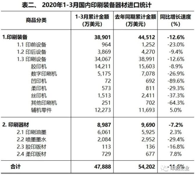 2020年1月—3月,國內印刷裝備進口3.89億美元,與去年同期相比,下降12.6%。其中,印前設備進口964萬美元,同比下降23.0%;印刷設備進口3.41億美元,同比下降12.6%;印后設備進口3869萬美元,同比下降9.4%。