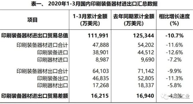 2020年1月—3月,國內印刷裝備、器材進出口總值11.20億美元。與去年同期相比,下降10.7%。其中,進口4.79億美元,同比下降11.6%;出口6.41億美元,同比下降9.9%。本期國內印刷裝備、器材進出口貿易順差1.62億美元,同比下降4.3%。