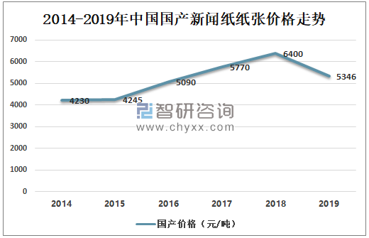 面對報紙用紙量減少,新聞紙市場供大于求,價格一路走低,2010-2019年,我國新聞紙價格水平在4000/噸-6500/噸之間波動,自2015年新聞紙價格不斷攀升,于2018年末達到高點,隨后又逐漸下降。2019年,我國新聞紙價格降至5346元/噸。