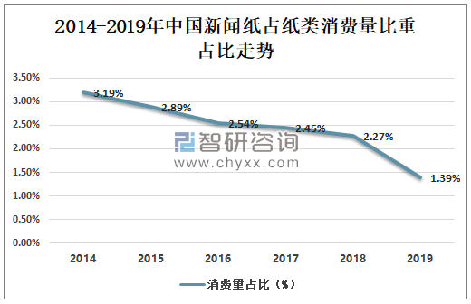 面對報紙用紙量減少,新聞紙市場供大于求,消費量一路走低。從2014年開始至今,新聞紙消費量占比下滑,到2019年消費量占比為1.39%。比去年消費量占比幅度減少較大。