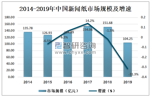 新聞紙市場規模從2017年開始持續下降,到2019年中國新聞紙市場規模為104.25億元,比去年下降47.43億元,同比下降31.3%。