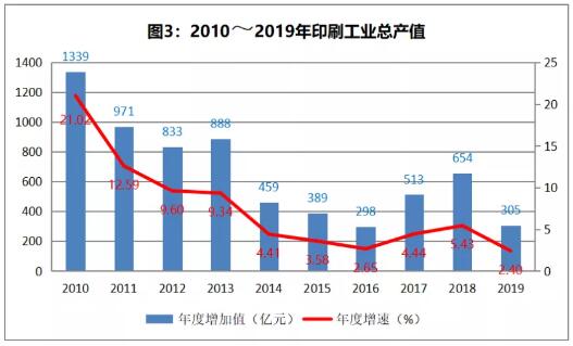 近年來,我國印刷業增長速度逐年放緩,2012年增速跌破兩位數,達到9.60%;隨后的2013年~2015年,增速分別為9.34%、5.30%、3.60%;到2016年增速創近年新低,達到2.7%;隨后觸底反彈,2017年和2018年印刷業增速分別為4.60%和5.40%。2019年,全行業的工業總產值增速為2.4%,只能說是低速增長,這個速度也是10年來的最低速。